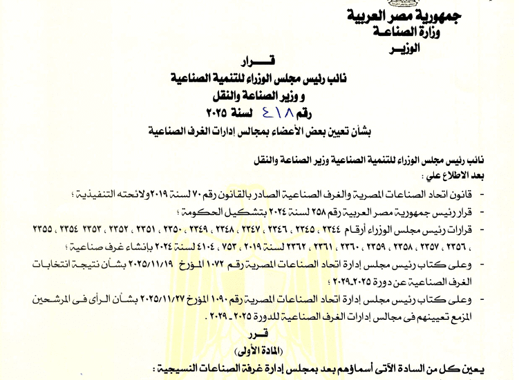 قرار نائب رئيس مجلس الوزراء للتنمية الصناعية و وزير الصناعة والنقل رقم ٤١٨ لسنة ٢٠٢٥ بشأن تعيين بعض الأعضاء بمجالس إدارات الغرف الصناعية